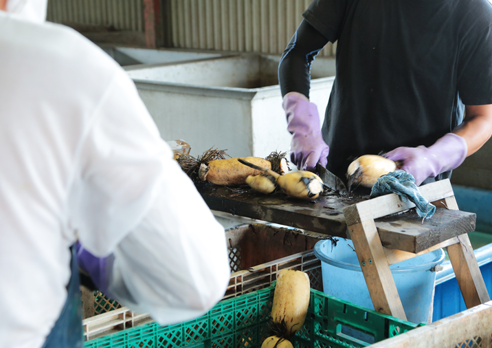 蓮根には、それぞれの個性があります。その個性を瞬時に見極めニーズに合わせての選果、節の整え作業を行います。